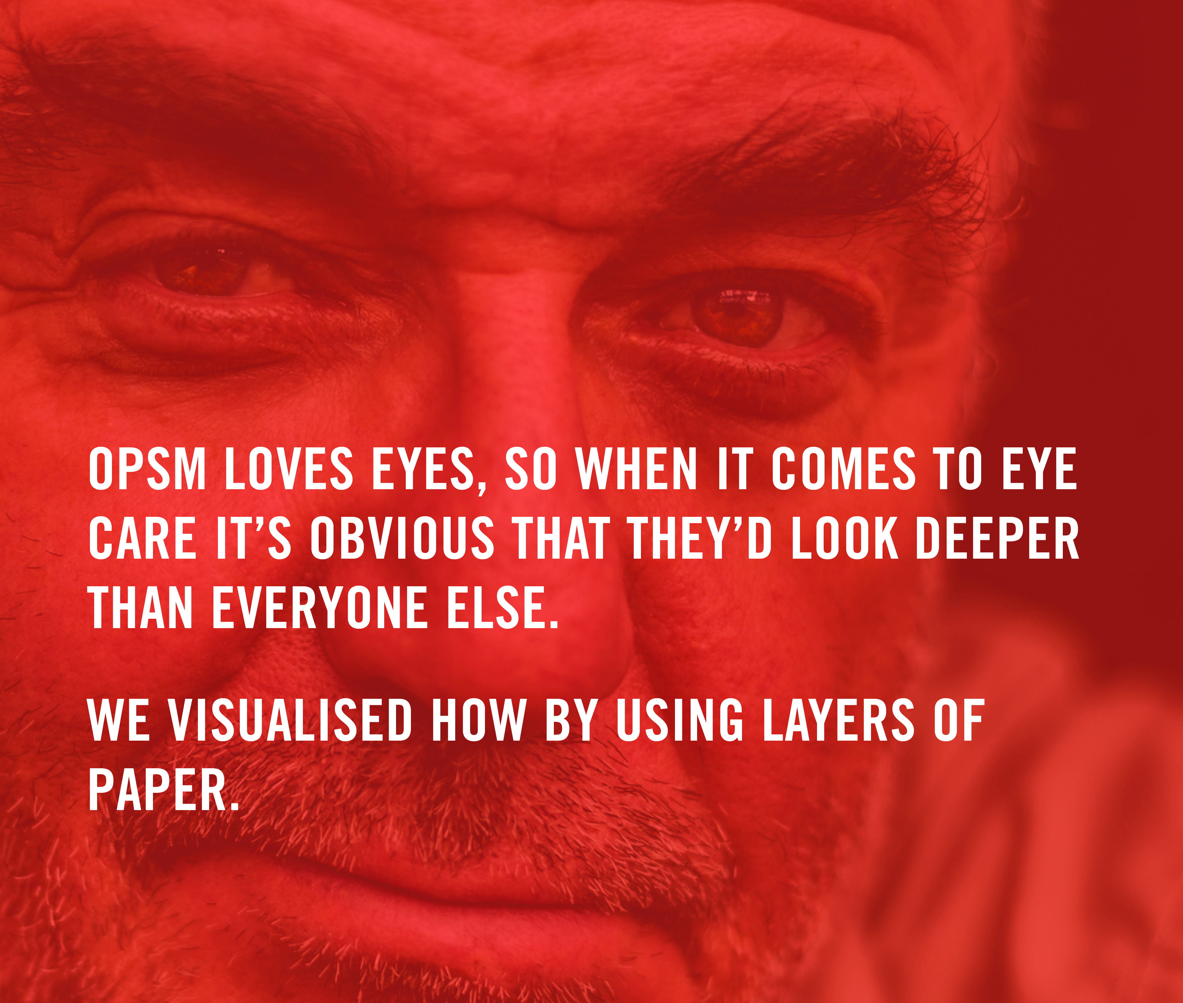 You pretty much take your eyes for granted, and we feel it’s now time to acknowledge them. They help us to see and experience some fairly amazing things, but there’s one thing they can’t actually look at. Themselves. Through the use of OPSM’s eyecare technology, and a visual representation based on layers, upon layers of paper, we can show security seekers the health of their eyes, help protect them and help them cherish their vision for the years ahead. Because of OPSM’s delevoping technology and care, we can look deeper into the health of your eyes more than anyone else can.